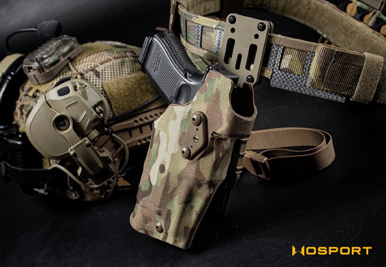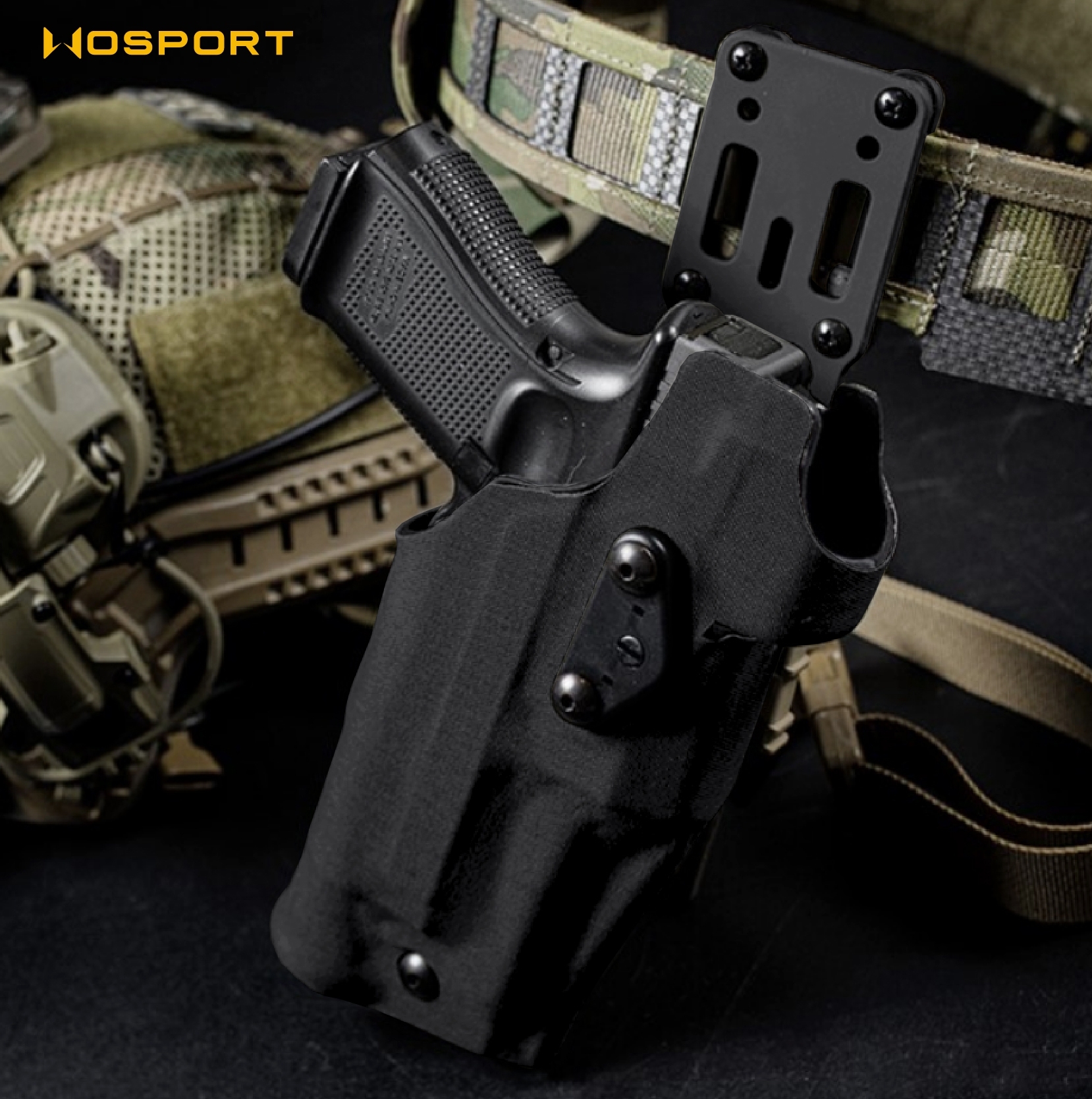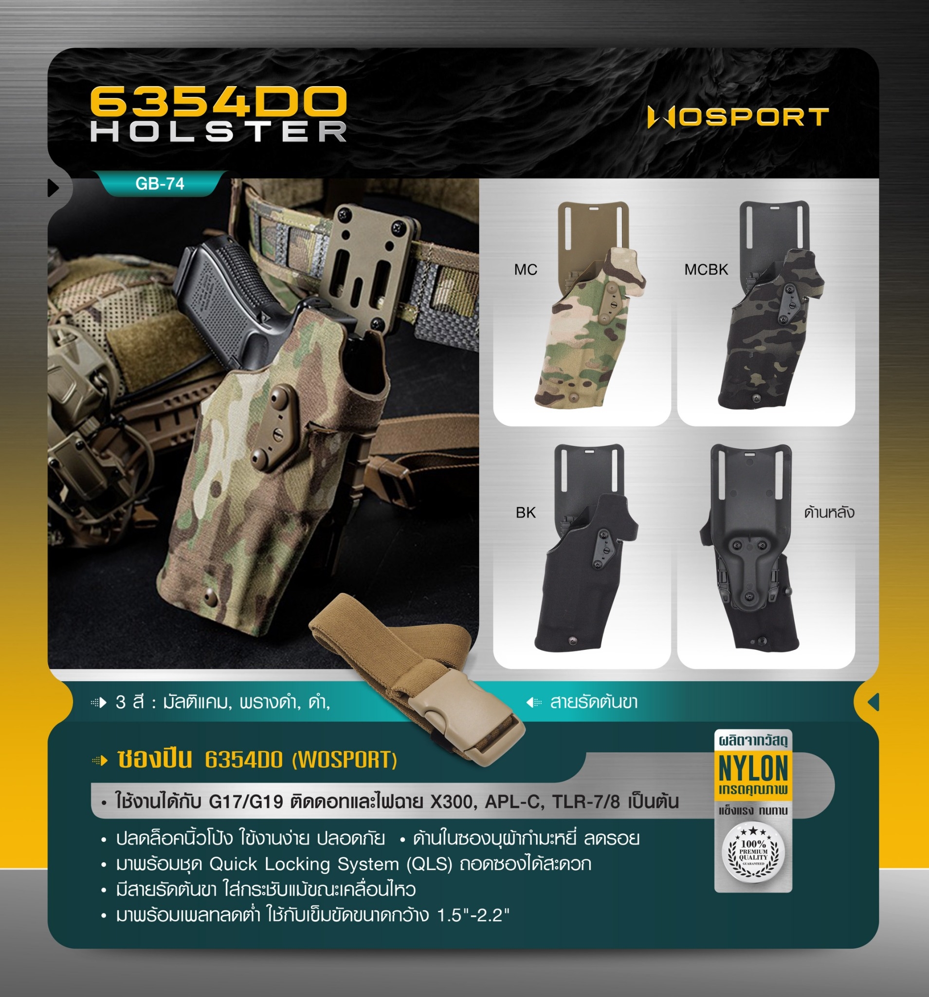 New. ซองปืน 6354DO ( WOSPORT ) 6354DO Holster [ GB-74 ] ⚡ซองผลิตจากวัสดุ Nylon เกรดคุณภาพ ⚡ปลดล็อคนิ้วโป้ง ใข้งานง่าย ปลอดภัย ⚡ใช้งานได้กับ G17/G19 ติดดอทและไฟฉาย X300, APL-C, TLR-7/8 เป็นต้น ⚡ด้านในซองบุผ้ากำมะหยี่ ลดรอย &
