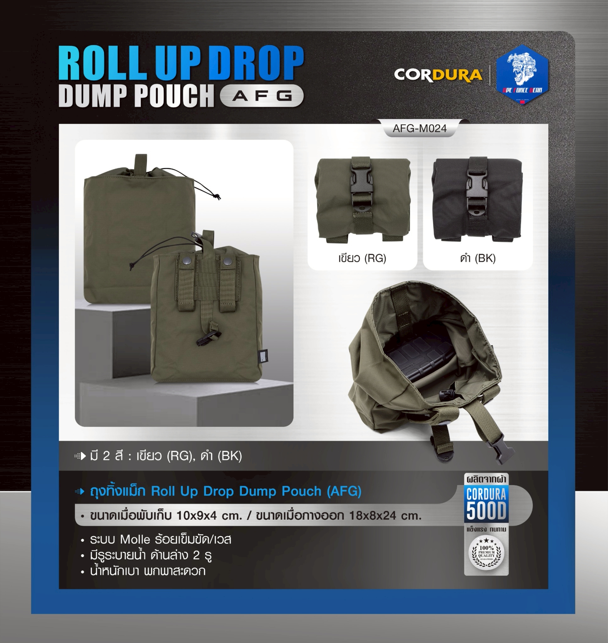 ![New.ถุงทิ้งแม็ก (AFG) Roll Up Drop Dump Pouch (AFG) [ AFG-M024 ] - ผลิตจากผ้า Cordura 500D - ขนาดเมื่อพับเก็บ 10*9*4 cm. - ขนาดเมื่อกางออก 18*8*24 cm. - ระบบ Molle ร้อยเข็มขัด/เวส - มีรูระบายน้ำ ด้านล่าง 2 รู - น้ำหนักเบา พกพาสะดวก 4 สี : BK/RG/MC/MCBK](https://dc.lnwfile.com/_/dc/_raw/vr/zz/ue.jpg)